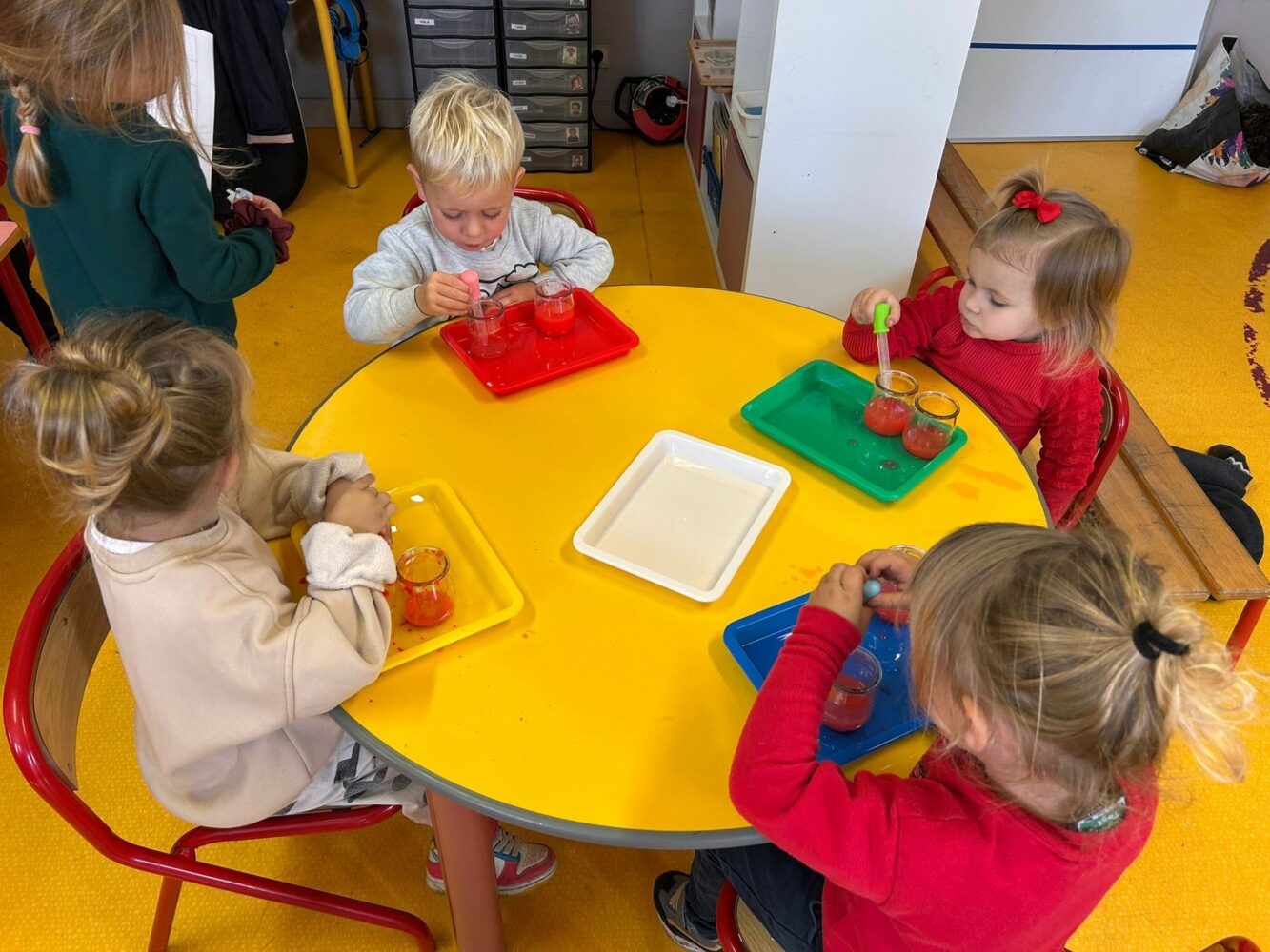 Chaque jour, les enfants étaient invités à s’habiller de la couleur de la journée, en lien avec les aventures de notre loup. Cette démarche ludique avait un double objectif : apprendre et reconnaître les couleurs, tout en offrant aux élèves des repères visuels pour se situer dans le temps, avec une couleur différente chaque jour de la semaine. De nombreux ateliers adaptés à chaque niveau ont été proposés. Les élèves de Petite Section ont participé à des activités de tri d’objets par couleur, tandis que les enfants de Moyenne Section ont réalisé un livre de la semaine, retraçant jour après jour les couleurs découvertes.
